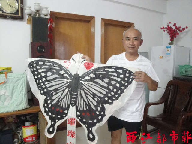 ????張錦雄說,每次扎風箏總少不了要忙上十天半個月,從風箏的造型設計,到選材、扎框架、糊油布,每一環節都須用心,有時還得熬夜。在去年的第十屆梧州寶石節風箏大賽風箏制作比賽上,張錦雄制作的風箏曾奪得三等獎。