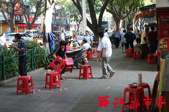 10月30日8時30分,記者來到實地走訪發現,上述兩名網友所反映的情況的確存在。據觀察,該街道上占道經營的餐飲店約五家,多數為經營早餐生意的店鋪。這些店鋪面積不大,并沒有太多空間供顧客就餐。因此,店鋪的經營者往往在店前人行道上擺放桌椅供顧客使用。另外,部分顧客的保潔意識較差,經常隨手把用完的紙巾、牙簽、筷子等物隨地丟棄。