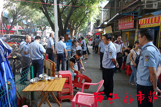 當天8時45分,接到舉報投訴信息的城監執法人員到現場執法。許多店鋪經營者見狀立刻匆忙收拾占道的桌椅。盡管如此,城監執法人員還是依法對部分店鋪經營者進行處罰。