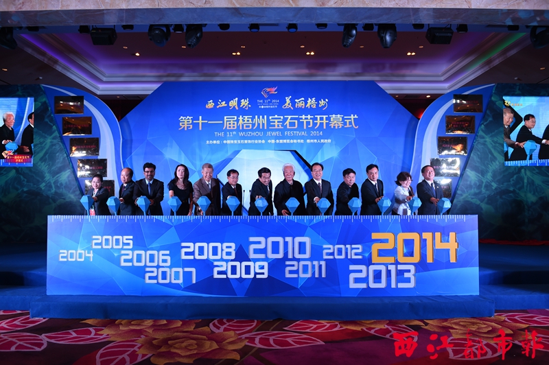????9時(shí)30分左右,十三位領(lǐng)導(dǎo)和嘉賓共同推動(dòng)寶石造型拉桿,隨著音樂響起,深藍(lán)色的舞臺(tái)中央巨大而閃亮的寶石LOGO發(fā)出耀眼的光輝,第十一屆梧州寶石節(jié)正式啟動(dòng)。