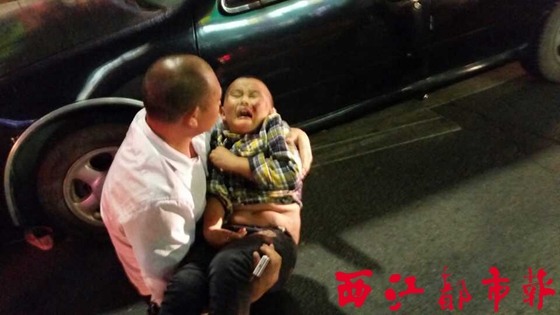 ????“大家都來幫幫忙啊!”蒙先生和幾名先行救人的市民大聲向周邊過往路人求助。蒙先生說,聽到求助呼喊后,不少過往市民都停下了腳步,近二十名市民加入了抬車救人的行列中。“一、二、三……”,在現(xiàn)場(chǎng),救人的男子漢們喊著號(hào)子,一起出力將小轎車抬起。經(jīng)過大家的努力,卷入車底的小孩被成功解救出來。孩子被救出來后,人群中一名中年男子上前一把抱起的小孩,緊緊地?fù)ё⌒『ⅲ『⑦@才哇哇大哭起來。此時(shí),交警和120急救車剛好趕到,中年男子和小孩被送往附近的梧州市紅會(huì)醫(yī)院救治。