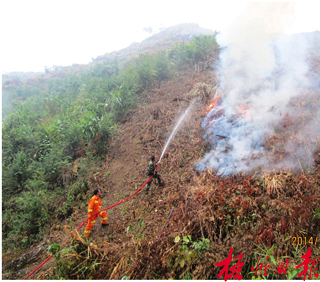????11月5日下午,蒼梧縣專業(yè)森林消防隊(duì)員正在沙頭鎮(zhèn)參田村采用高壓細(xì)水霧滅火機(jī)滅火。