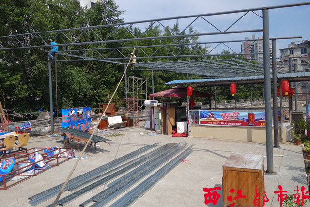 ????西江都市報訊(記者 龍天傳)搭建入室棚架、搬遷金砂玉石展館、設置路口指示牌。眼下,梧州市富民特色街內正在進行忙碌的施工。記者采訪獲悉,梧州市富民特色街正將原花卉區改建為以六堡茶香美食為主題的美食休閑區。該特色街負責人陳碧霞受訪時稱,今后,特色街內美食結合奇石,可讓市民既享口福又飽眼福。
