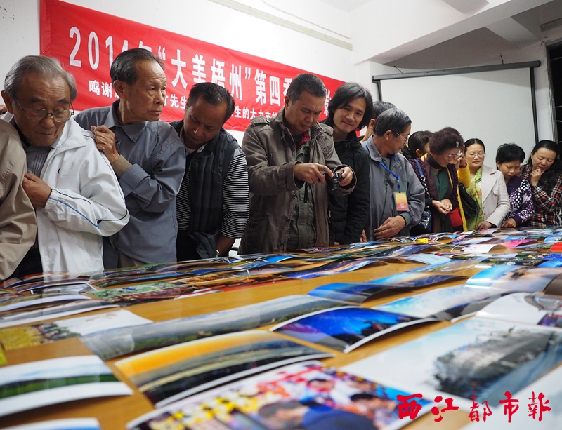 ??? 11月14日晚,攝影愛好者在梧州市攝影家協(xié)會舉辦的2014年“大美梧州”攝影比賽中觀摩參賽作品。