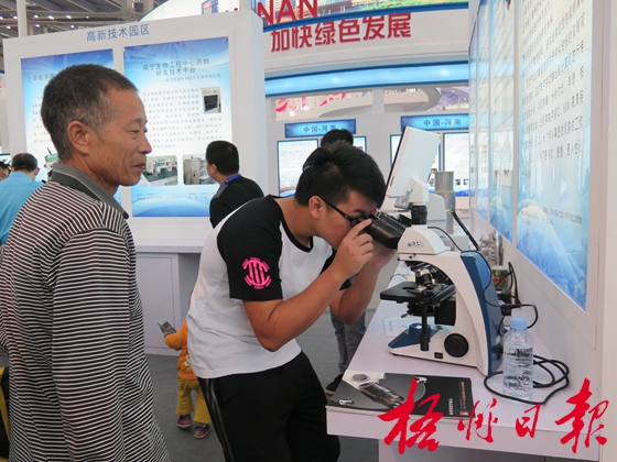 ?11月16日,在第十六屆中國國際高新技術成果交易會梧州代表團展位,與會人員正操作復合型光電顯微分析檢測儀器,了解其性能。李欣鞠 攝