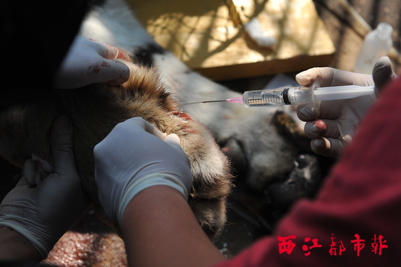 ????20分鐘后,“慶慶”好像已經支撐不住了,在角落安靜地趴著。又過了一會,“慶慶”的頭已經搭在了前爪上,舌頭吐了出來。“一般麻藥都有少許呼吸抑制的效果,它舌頭吐出來了,證明它基本已經被麻醉了。”工作人員說。