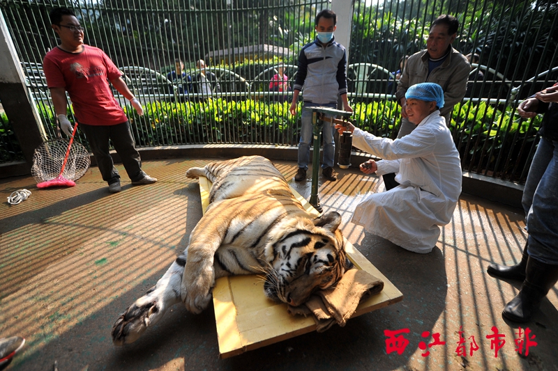 老虎“慶慶”200多公斤的重量讓獸醫嚇了一跳。籠養環境優越,讓老虎“慶慶”的體重超重不少。