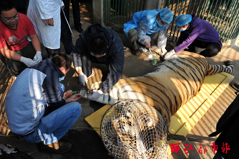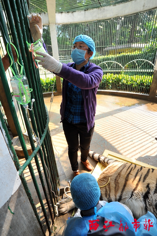 為保證老虎麻醉時的生理指標正常,獸醫幫老虎掛起兩個吊瓶的藥水。