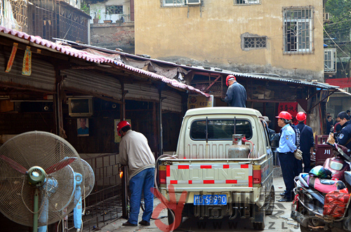 ????據記者觀察,絕大部分占道的攤位和違章建筑店鋪當天已把貨物搬離現場,只有一家餐飲店鋪仍在營業,直到相關人員到場催促才開始收拾撤離,期間還不時抱怨沒有給足夠的時間撤離。對此,張少兵向記者解釋,這個月初就已經對這一帶的各個攤位、商鋪下達了撤離、整改通知書,書面通知他們要限時進行搬離,但是該餐飲店仍經營至今。“除了要拆除鋁板、鐵架搭建起來的帳篷外,還有拆除一間磚混結構的建筑物,所以需要挖掘機進場進行拆除。”張少兵說,環境綜合整治隊伍將在攤主撤離后依次對這些攤位的棚架進行拆除。