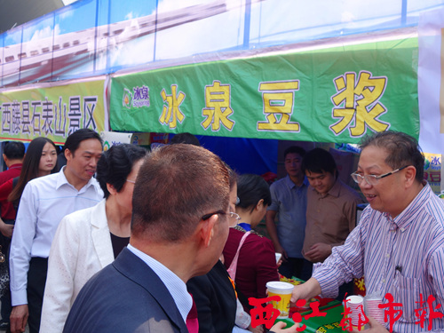 當(dāng)天上午,梧州市展位內(nèi)人頭涌動(dòng),大批肇慶市民群眾爭相購買和品嘗六堡茶、紙包雞和冰泉豆?jié){,并對(duì)蒙山絲綢、藤縣石表山風(fēng)景區(qū)表現(xiàn)出濃厚的興趣。