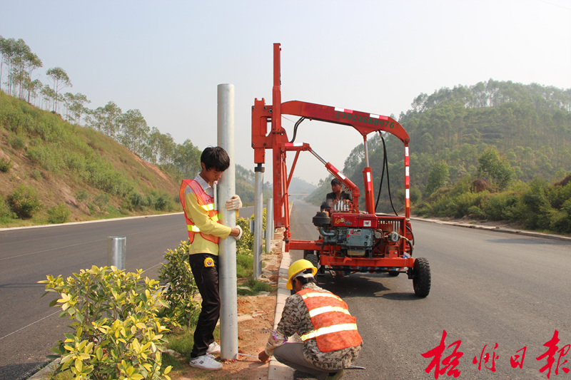 11月22日中午,在梧(州)貴(港)高速公路藤縣段,施工人員正在利用液壓機在安裝公路中間隔離欄。 據施工負責人介紹,施工人員堅持從每天早上6時一直干到晚上8時,以每天安裝不少于500根樁的任務強力推進,確保高速公路在2015年春節前通車。李偉明 林國強 攝