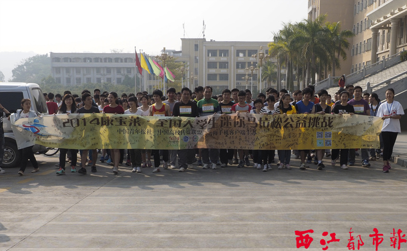 11月22日上午10點,隨著一聲號令,2014康寶萊·全國大學生迷你馬拉松公益挑戰活動梧州學院站,在學院綜合大樓前起跑,300多名師生和志愿者參與了這次5公里長的迷你長跑活動。