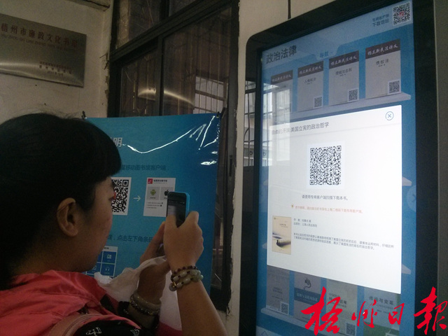 ????11月23日,在市圖書館二樓,讀者在掃描書籍的二維碼,將電子書下載到手機中。