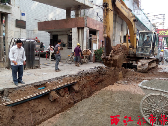 ????11月27日,記者在日化路萬秀區教育局對出路段的施工現場看到,已經封閉的施工區域內,路面已被開挖,一臺鉤機正在工作?,F場施工人員胡先生表示,眼下,該施工現場正在做市政排水管道、供水管道的移改施工,“原本的市政大渠位于路面中間,現在把它移到路面一側,屬于管線移改的工作之一。”