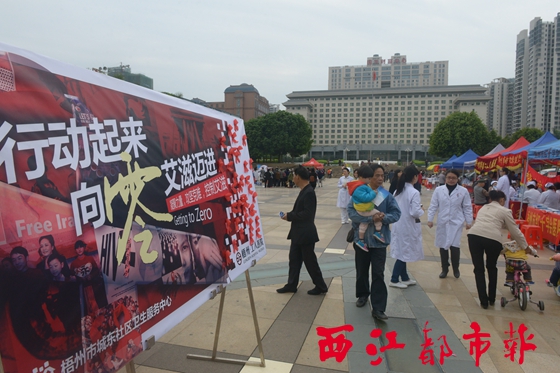 ????西江都市報訊 (記者 謝韻 通訊員 陳秋玲) 12月1日,主題為“行動起來,向‘零’艾滋邁進”的大型防艾宣傳活動,在梧州市市政廣場舉行。現(xiàn)場的工作人員通過派發(fā)宣傳單、進行游藝活動等形式,向社會公眾宣傳和普及艾滋病防治知識。