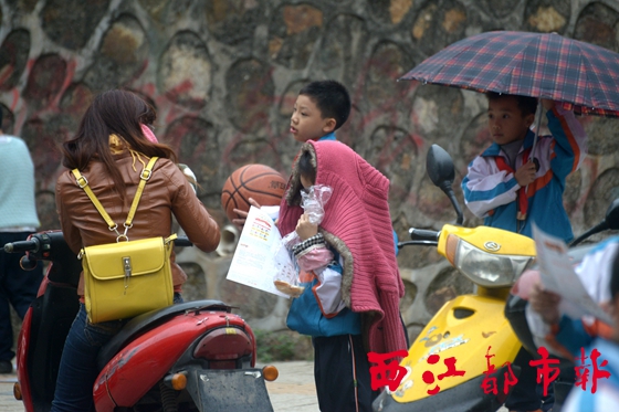?12月2日下午,市內氣溫相比當天上午有所下降。在新興二路小學,接孩子放學的家長給孩子帶上了御寒的衣物。本報記者 蒙紹松/攝