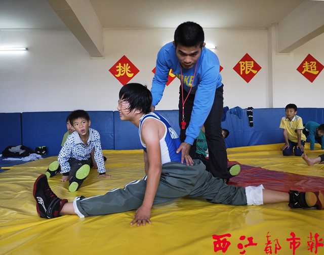 ????“潭津中心校的學生接近6000人,大部分是農民工子女,他們能吃苦、獨立性強。”教練覃后城說。曾多次獲得全國摔跤比賽的前三名的覃后城,是梧州市體育局的特派教練,從事專業摔跤運動超過12年。他對學員們的訓練要求特別嚴苛。