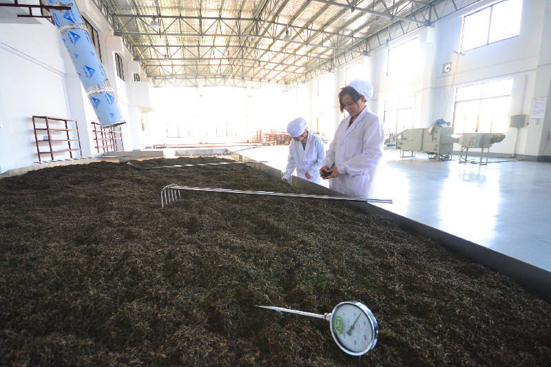 12月10日,梧州福匯堂茶業公司的工人在車間內將茶葉渥堆發酵。