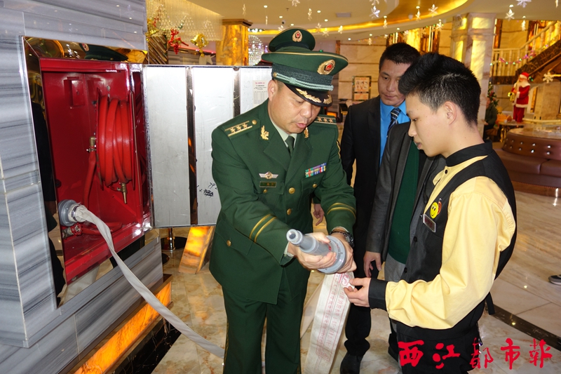 12月16日晚,梧州市公安消防支隊支隊長陳堅平向娛樂場所的員工演示如何使用消防水帶。 本報記者 龍天傳/攝