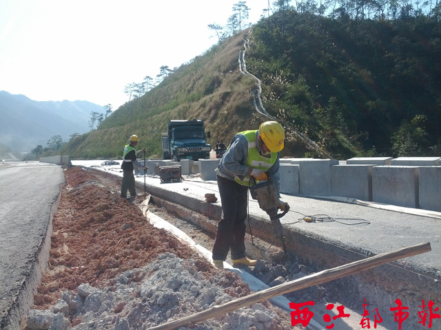 12月20日,施工人員正在岑水高速公路施工現場進行路面綠化帶排水渠施工。 本報記者 黃海志/攝