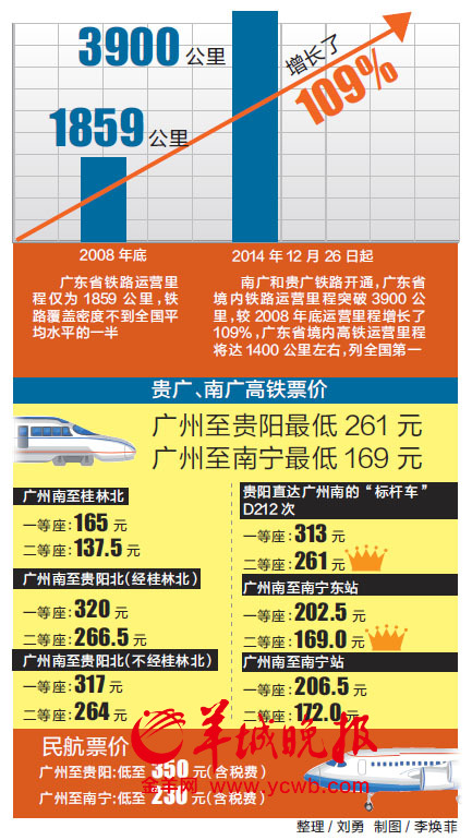 貴廣、南廣高鐵車票昨日開賣,相關線路的機票價格跌至冰點。記者查詢發現,現在預訂12月26日以后廣州飛貴陽和南寧的機票都有3折以下特價。