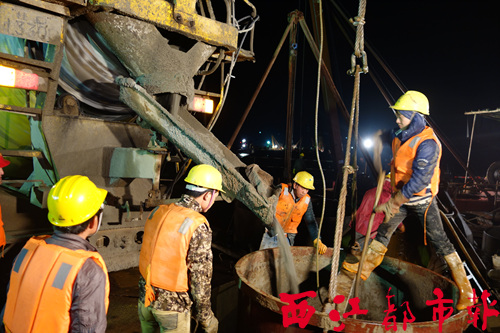 12月26日21時,位于梧州市環城公路K29公里處的西江特大橋項目施工現場燈火通明。此時,該項目第一根水下樁基即將進行混凝土澆筑工作,施工人員正在緊張地籌備各項準備。凌飛鵬身穿救生衣、頭戴安全帽,在寒風細雨中指揮著運輸車的出料口對準樁孔處,其余的施工人員拿來繩子進一步固定樁孔的位置。22時許,隨著大量已調配均勻的混凝土從樁口處直瀉進入樁底,整個樁基被填滿。