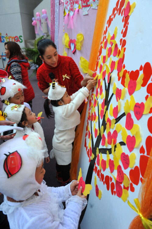 2014年12月31日,小朋友和家長一起在“心愿樹”上,貼上新年心愿卡片。當日,梧州市一幼玥城實驗幼兒園舉行親子迎新年活動,家長們來到幼兒園與孩子和老師聯歡,一起許下對新年的美好祝愿,共同迎接2015年元旦的到來。 記者 何鎏/攝