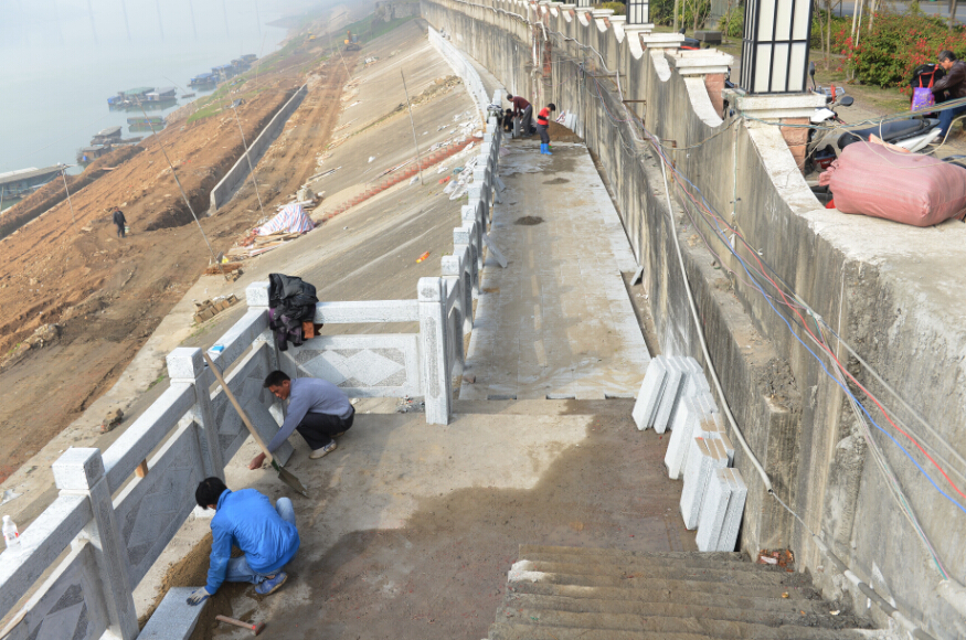 2014年12月30日,在西堤公園外,工人正在進行堤外人行道施工。 據了解,近段時間天氣晴好,西江汊河橋至角嘴段岸坡景觀提升工程(一期)也抓緊施工,全力加快進度。目前,最上級的人行道已經修建欄桿、鋪設地面400多米,第二級人行道以及部分緩坡正在加快路面平整。 李鴻榮 攝
