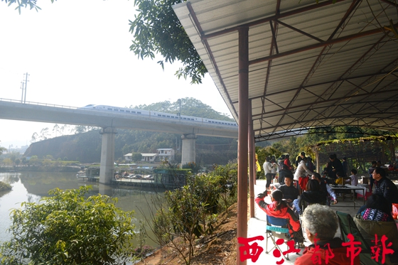 2015年元旦當天,部分市民在龍圩區(qū)的一處休閑農(nóng)莊里燒烤、游玩,不遠處南廣線的高架橋上,時而呼嘯而過的動車引起人們的歡呼。元旦放假期間,梧州市晴朗的天氣使戶外郊游成為眾多市民的選擇,大家呼朋喚友在山水間放松心情,享受度假的休閑時光。 本報記者 蒙紹松/攝