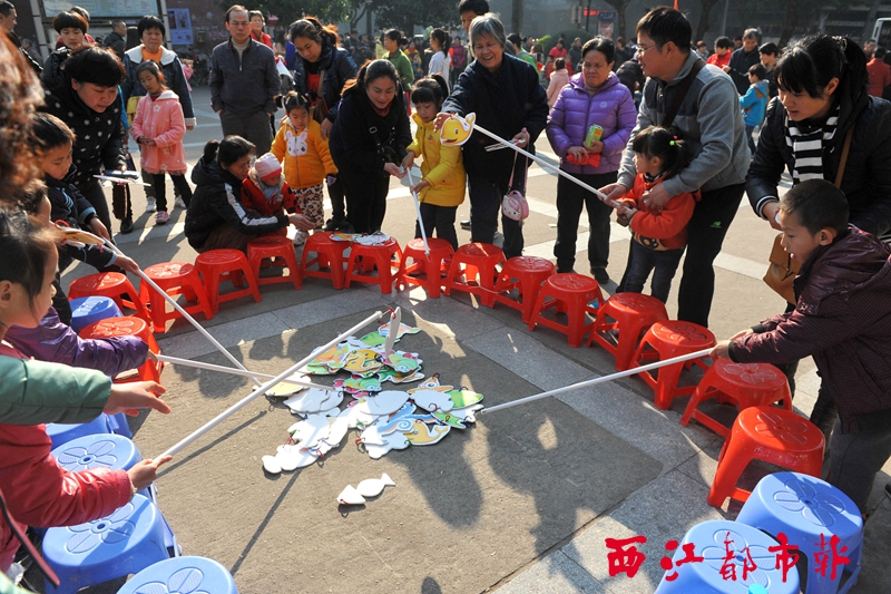 ?1月3日,家長和孩子一起參加“釣魚”游戲。當日,梧州市青少年宮在市內潘塘公園入口小廣場舉行新年親子游園活動,眾多家長帶領孩子前來參加各種游戲,贏取小禮品,歡聲笑語吸引眾多過路市民的關注。 本報記者 何鎏/攝