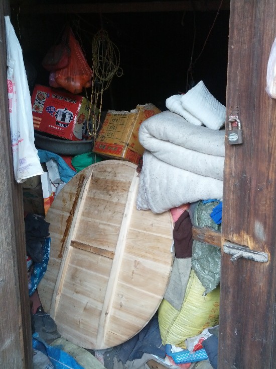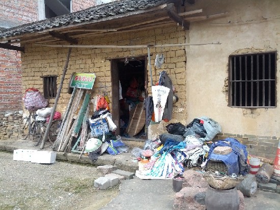 ????在梁壯妙的帶領下,記者來到了歐德福在新圩街的住所。那是一間黃泥磚砌成的瓦房,門前堆放著農具、木材、衣褲、袋子以及一堆小包裝的洗浴液等雜物。當天上午,歐德福不在家,但大門沒有鎖,推開門后,記者看到屋里也是堆滿了棉被、食品、雜物等,走不進去,只留一個人的位置,剛好站得在大門左邊的房間門前,然而房間從里面上了鎖。