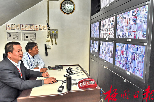 ????1月6日,在文華購物中心消防監(jiān)控值班室,工作人員通過視頻系統(tǒng)查看中心各處的安全情況。