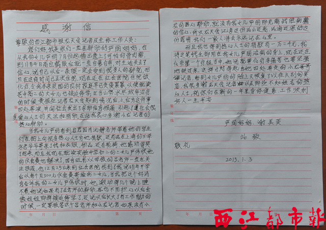 ????當天下午16點,謝美英帶著一封感謝信和一面錦旗來到本報編輯部。其中,在其親手書寫的感謝信里,字里行間充滿了對給自己女兒提供過幫助的愛心人士的感激之情。