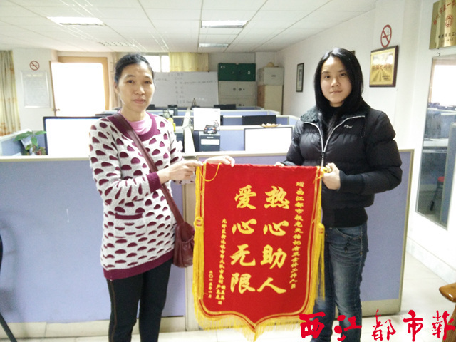 嚴麗的媽媽(左)來到本報編輯部把錦旗送到采編人員手中。本報記者 何鎏/攝