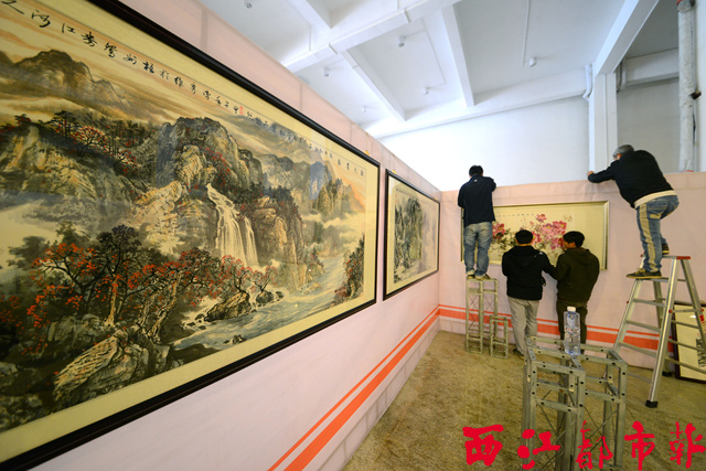 ????1月7日,工作人員在麗港華府商業中心,對即將開展的書畫作品進行布展。