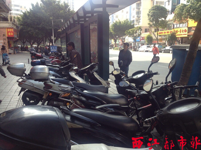 ??? 近日,新興西環(huán)路口公交車站后面停滿了電動車、助力車、摩托車等,致使市民候車時,不得不繞道或者從各種車輛中擠到站臺前。萬立平/攝
