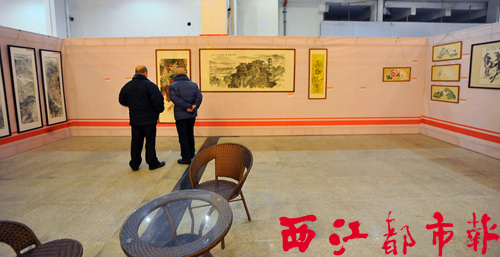 1月12日,市民在“疊彩飛花落誰家”第六屆梧州美術書法名家走向藝術市場作品展現場,參觀選購書畫作品。據了解,本屆作品展開展四天以來,已經有十多幅作品被市民選購。相比往屆作品展“慢熱”的銷售狀態,今年的銷售情況較為紅火。記者 何鎏/攝
