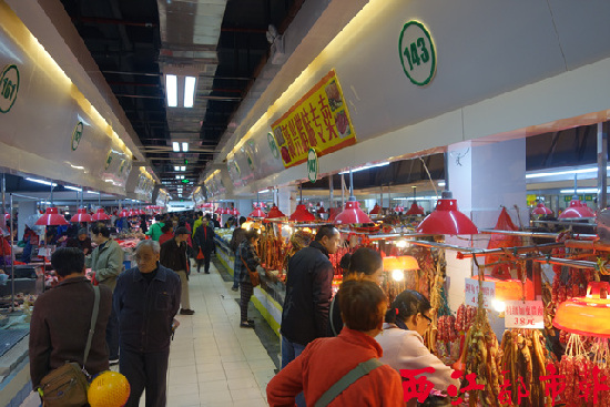 ????記者走訪觀察發現,升級后的新興市場做到劃行歸市,各類業態分布明顯。其中,整個西區經營業態包括干貨海味、熟食制品、水盤雞鴨、蠟制品、蛋豆制品、日用雜貨、豬牛羊狗肉等。除了醒目的導購標志外,開發商還把不同的業態以不同顏色的攤臺區分。