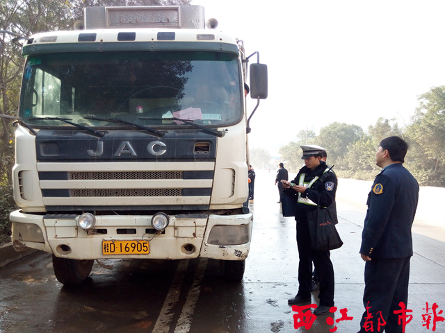 1月19日,在蓮花大橋南橋頭處,交警正對一輛泥頭車的相關證件進行核查。本報記者 吳艷虹/攝