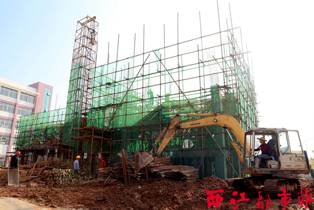 ????日前,在梧州市紅嶺小學施工現場,施工人員正在加緊施工,為新建教學綜合辦公樓搭建腳手架。