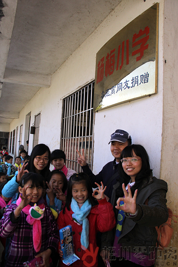 梧州零距離網(wǎng)記者、熱心網(wǎng)友與楊梅小學(xué)同學(xué)在校牌下拍照留念。騎樓論壇網(wǎng)友“蒼山梧川”攝
