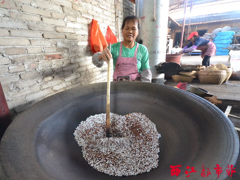 ????制太平米餅并不簡單,需要做好炒米、打粉、制餅、蒸餅等幾個步驟。炒米是在一個大鐵鍋中將糯米、高粱炒熟,待其出現膨松感,外黃里香后鏟出,再用碾米機或石磨將其碾成粉,然后攤在地上晾幾天,讓米粉有潤濕感,俗稱“吸地氣”。