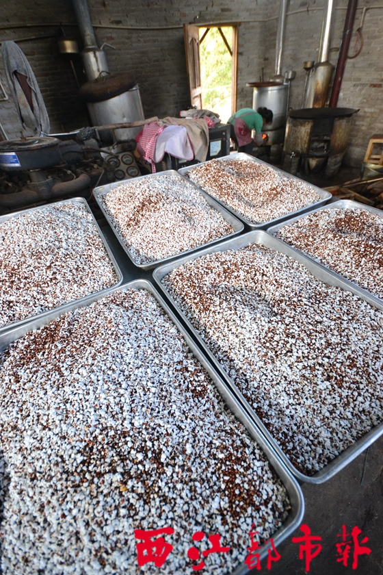 炒熟的糯米、高粱要“吸地氣”,之后用碾米機或石磨碾成制作米餅的粉末。