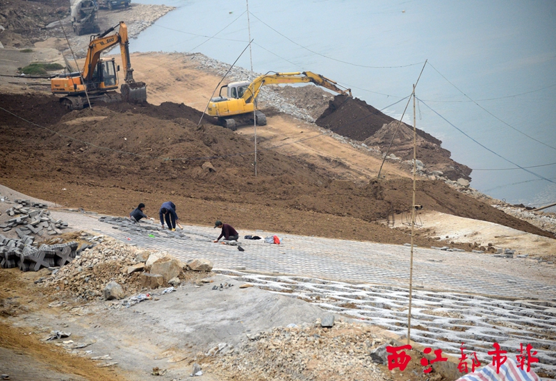 ?1月27日,施工人員在灝景尚都對出的西江江岸上鋪設護岸邊坡的地磚。目前,河西防洪堤堤外護岸景觀工程正抓緊建設,施工單位抓緊枯水期的有利施工季節邊平整邊坡,邊鋪設地磚,工程建設有序推進。 本報記者 蒙紹松/攝