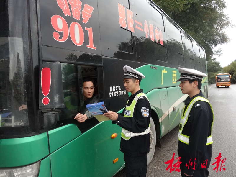 1月28日上午,在南梧二級公路富吉路段,藤縣公安交警在向過往大客車駕駛員發放資料,提醒注意行車安全。