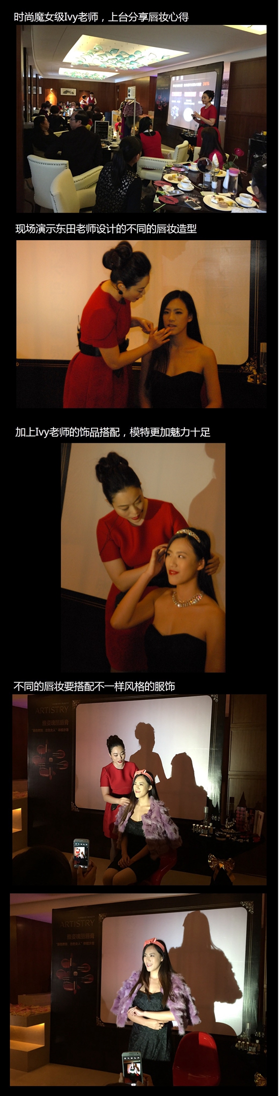 ??? 活動中,時尚達人Ivy老師巧用雅姿瑰麗唇膏在現場演繹“中國彩妝大師”李東田設計的5款唇妝造型,演示了5款顏色分別于不同的飾品,于不同的情境下的使用方法,解開了口紅顏色與全身搭配的秘密。讓大家都學到口紅與飾品的完美搭配,為自己的美麗加分。