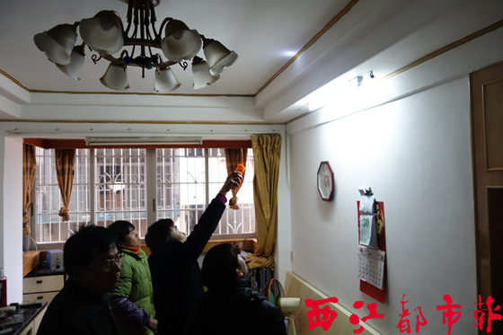 1月30日,梧州市建設工程質量安全監督站和云龍社區居委會等單位部門的多名工作人員到涉事居民樓內查看墻體開裂情況。本報記者 龍天傳/攝