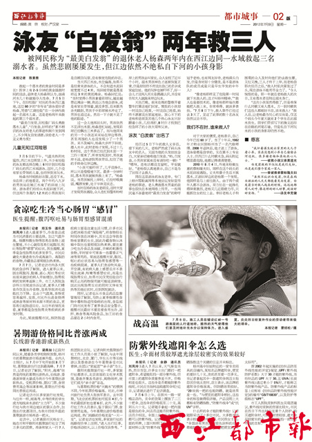????“我2010年救了一對夫婦,2012年救了一個小孩,2014年又救了一對外來務工青年。他們是得救了,但是難保什么時候又有人溺水,萬一我們都不在現場,誰來救人?”雖然夏天過去了,老楊依然憂心不已。老楊還說,自其中一次救人之后,肌肉緊張過了頭,現在游泳都不能盡全力了。