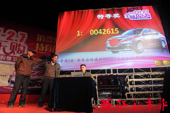????閉幕式上最讓人期待的就是特等獎的誕生。當(dāng)最后一名抽獎嘉賓上臺按下電腦按鍵,臺上大屏幕快速轉(zhuǎn)動的數(shù)字很快就停了下來,并顯示出本次消費購物節(jié)特等獎的中獎號碼:0042615。