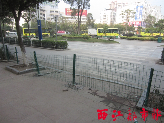 ??? 近日,有熱心市民向本報反映,梧州市長洲區紅嶺路的香城商貿城對開人行道出現一樁“怪事”:該人行道的斑馬線入口被一道鐵網無故擋住。更奇怪的是,這道鐵網是何人所為,其目的何在,均無人知曉。對此,許多路過的市民都怨聲載道。2月8日,記者再到現場走訪時發現,該人行道上的鐵網已被城監部門依法拆除。